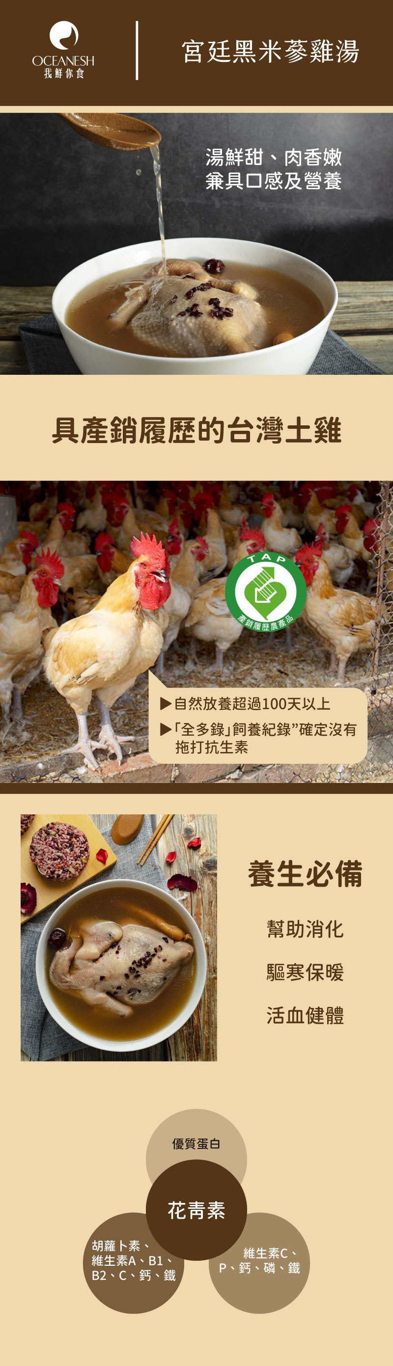成份:雞高湯(雞肉、水)、土雞(全雞)、黑米、人參、紅棗、枸杞、鹽、冰糖
