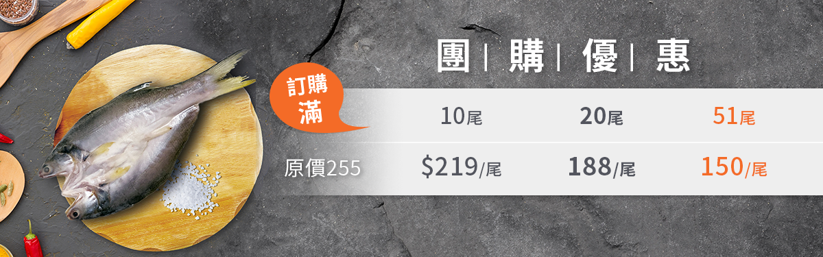 指定商品,午仔魚一夜干 165g±10%,團購優惠:訂購滿 10尾-229元/尾;20尾-203元/尾;51/尾-178元/尾